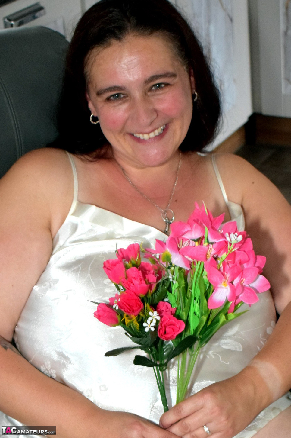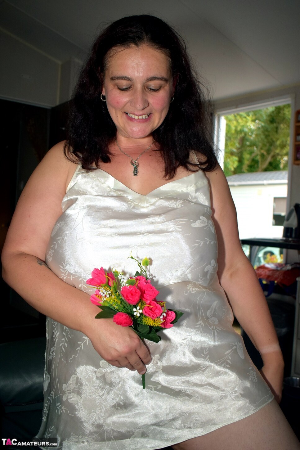 Sexy Cheeky Dee is on the sofa with some flowers sent by a fan wearing a white nighty witch she slowly removes.
