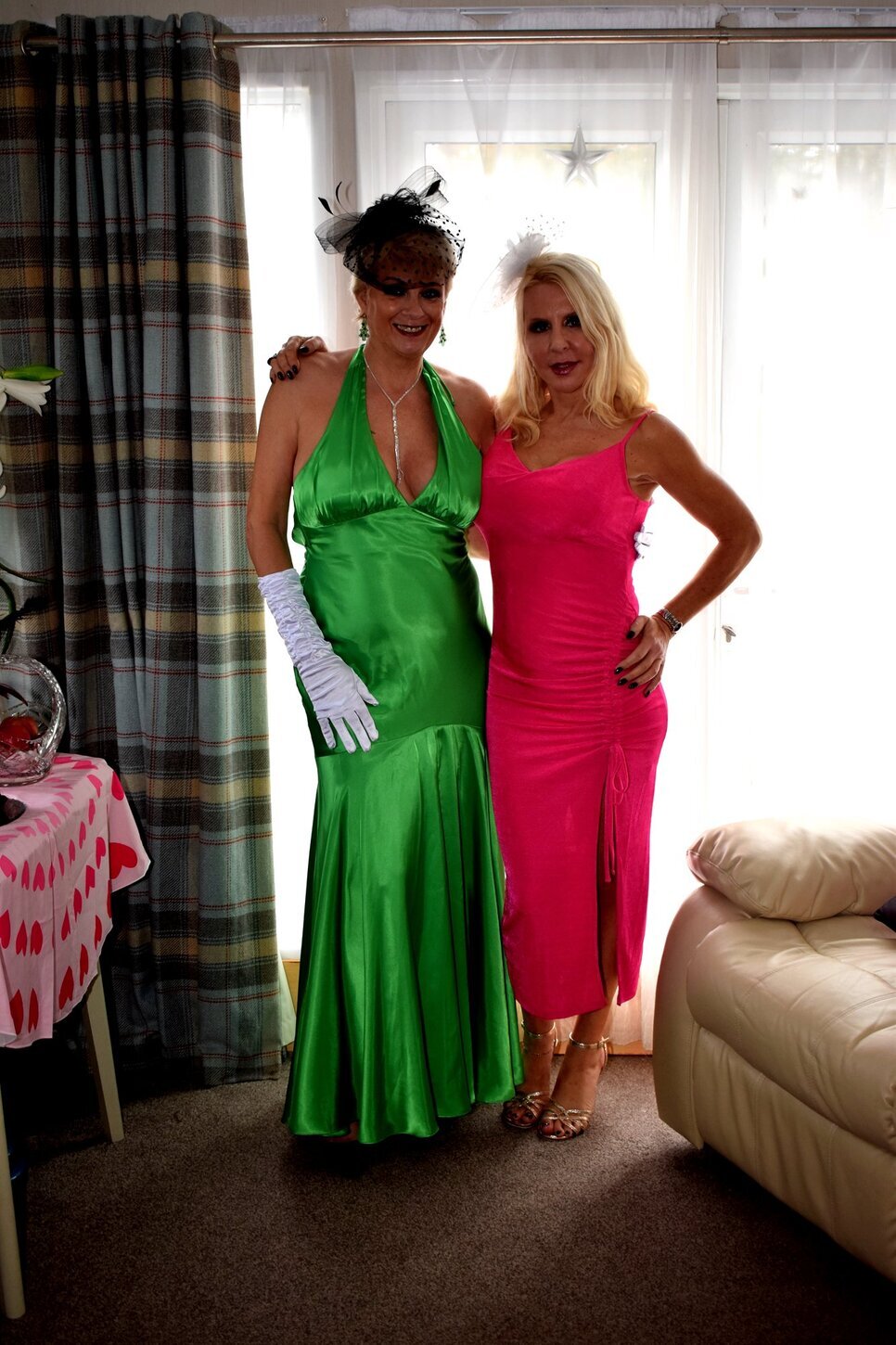 Dimonty is in a green dress and Emerald is in a pink dress and thaey slowly start to strip each other.