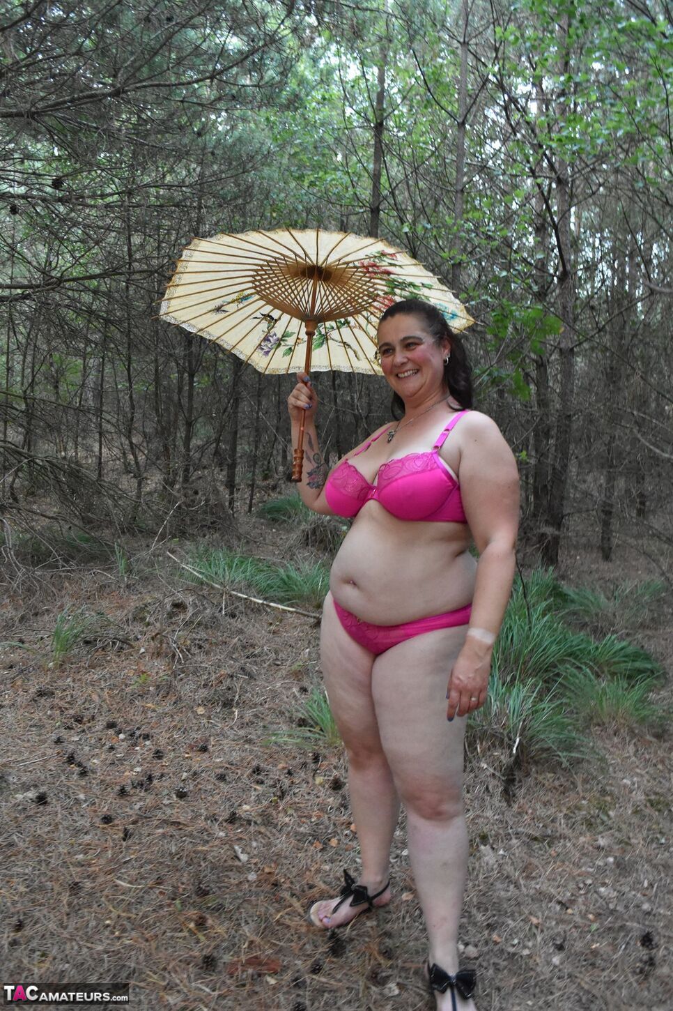 Cheeky is out in the woods and poses with a parasol and then strips naked