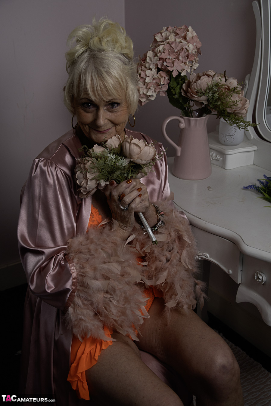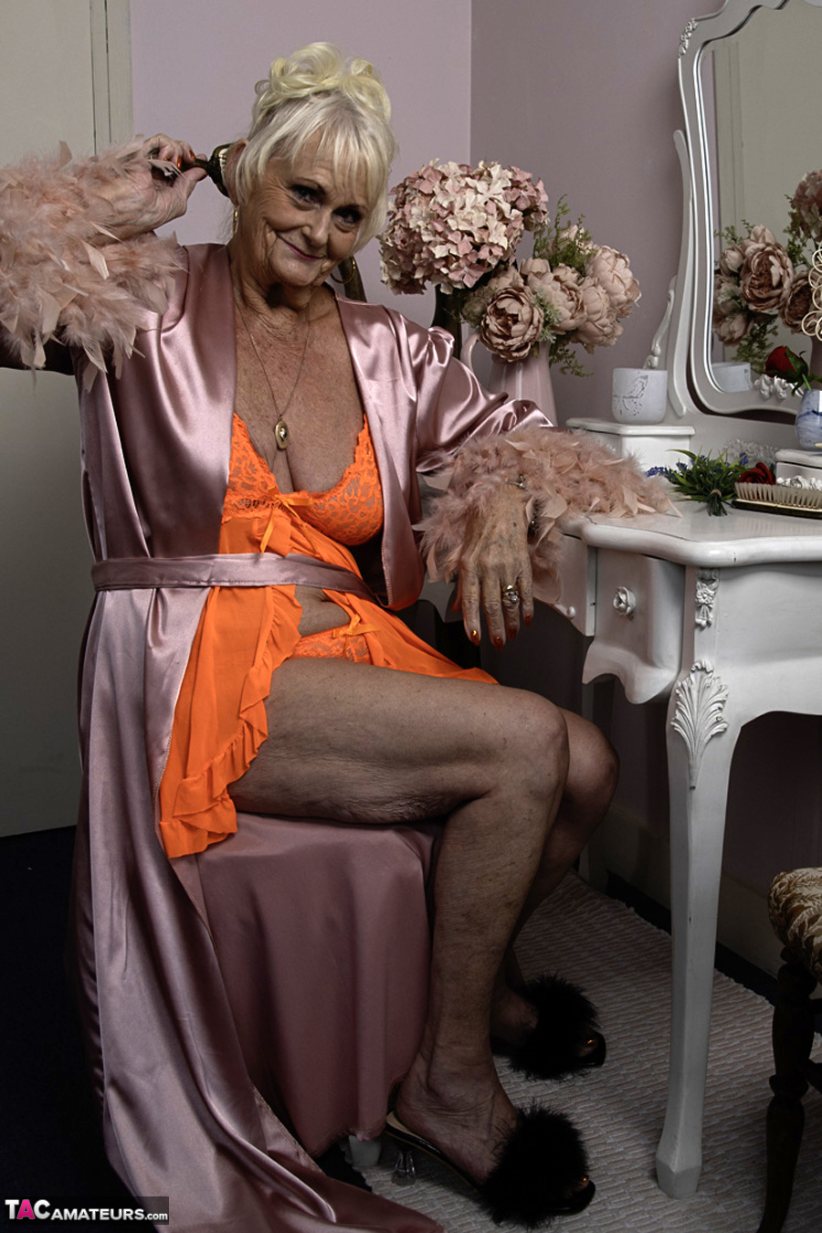 Sparkle is in an orange nighty flashing her 82 year old body including her tits and fanny.