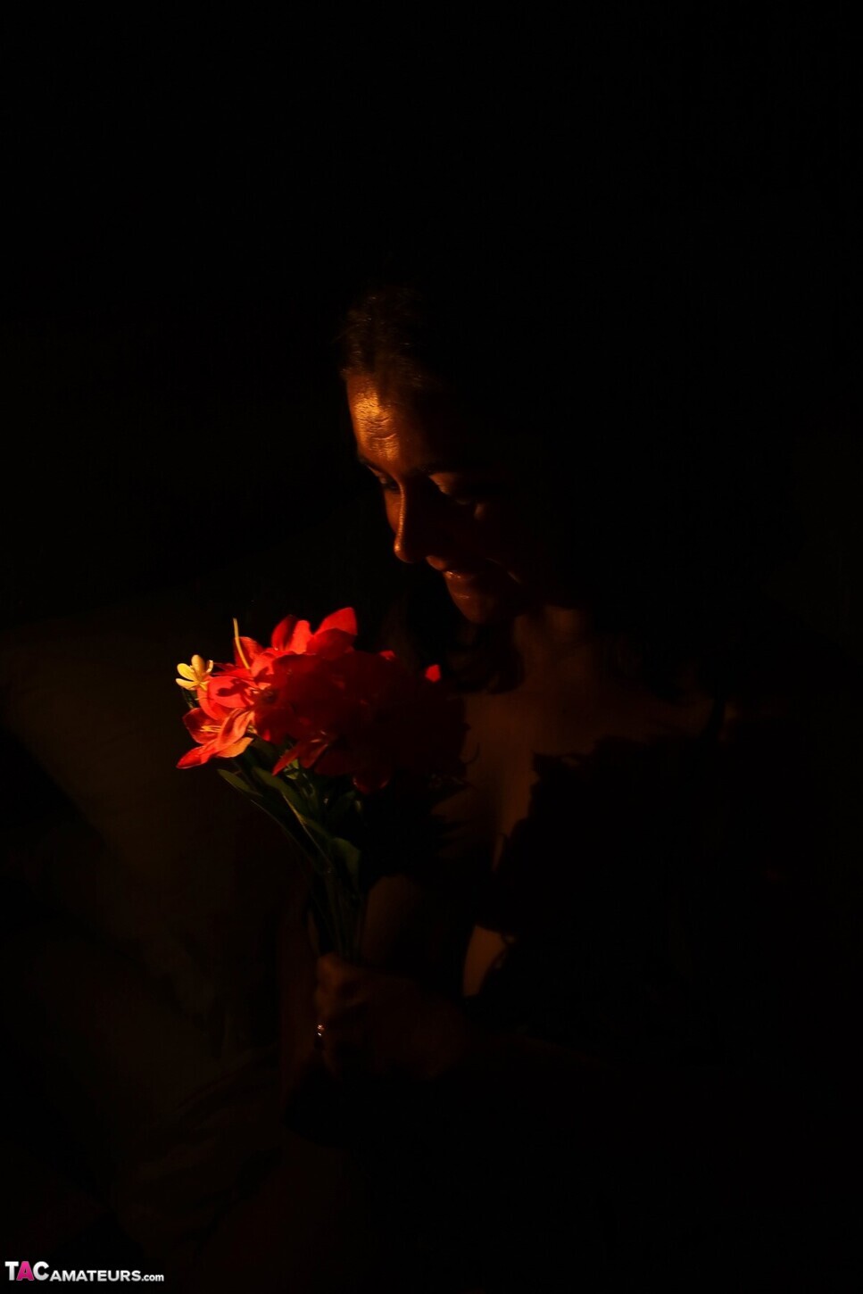 Sexy Cheeky Dee is on the sofa with some flowers sent by a fan wearing a white nighty witch she slowly removes.