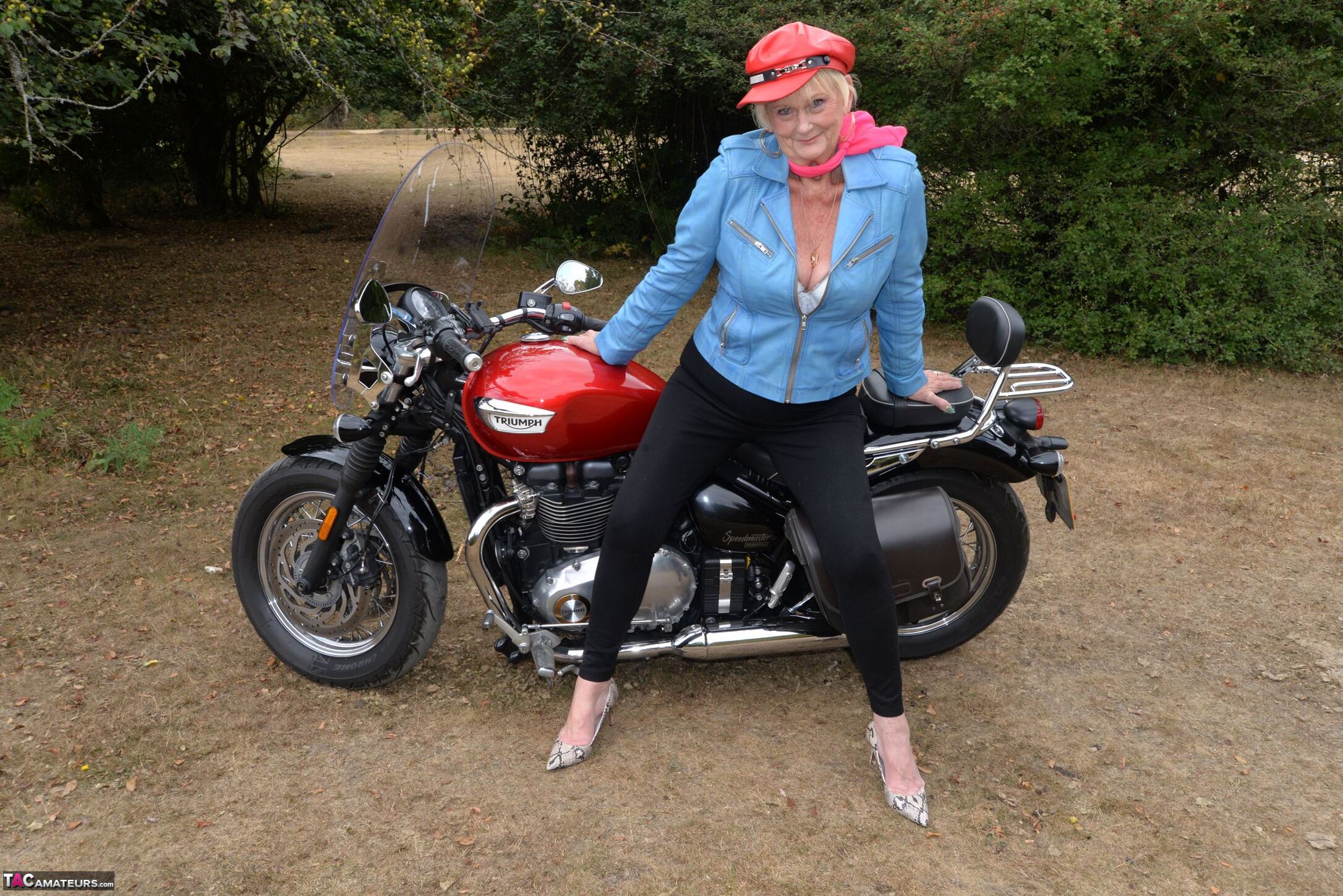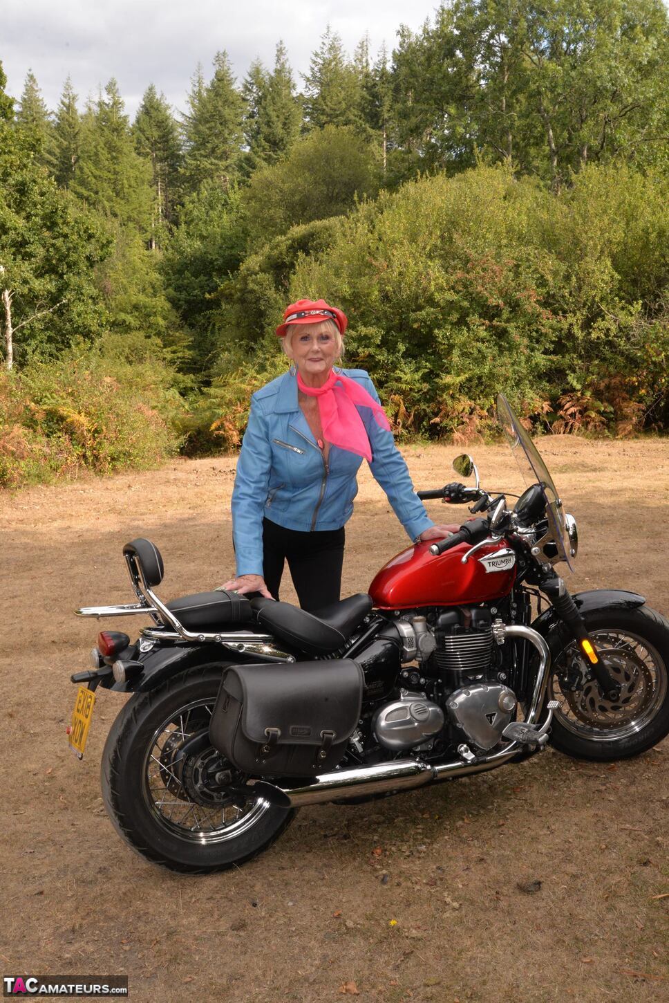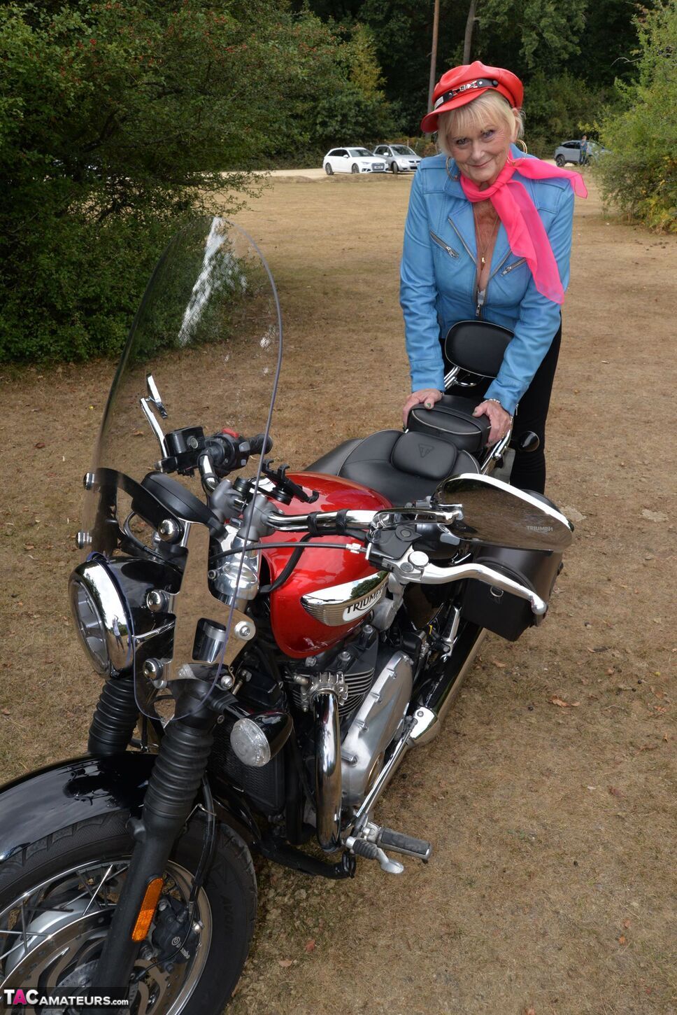 Check out this naughty 82 year old GILF Sparkle posing with her motor Bike.