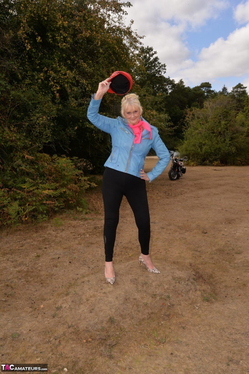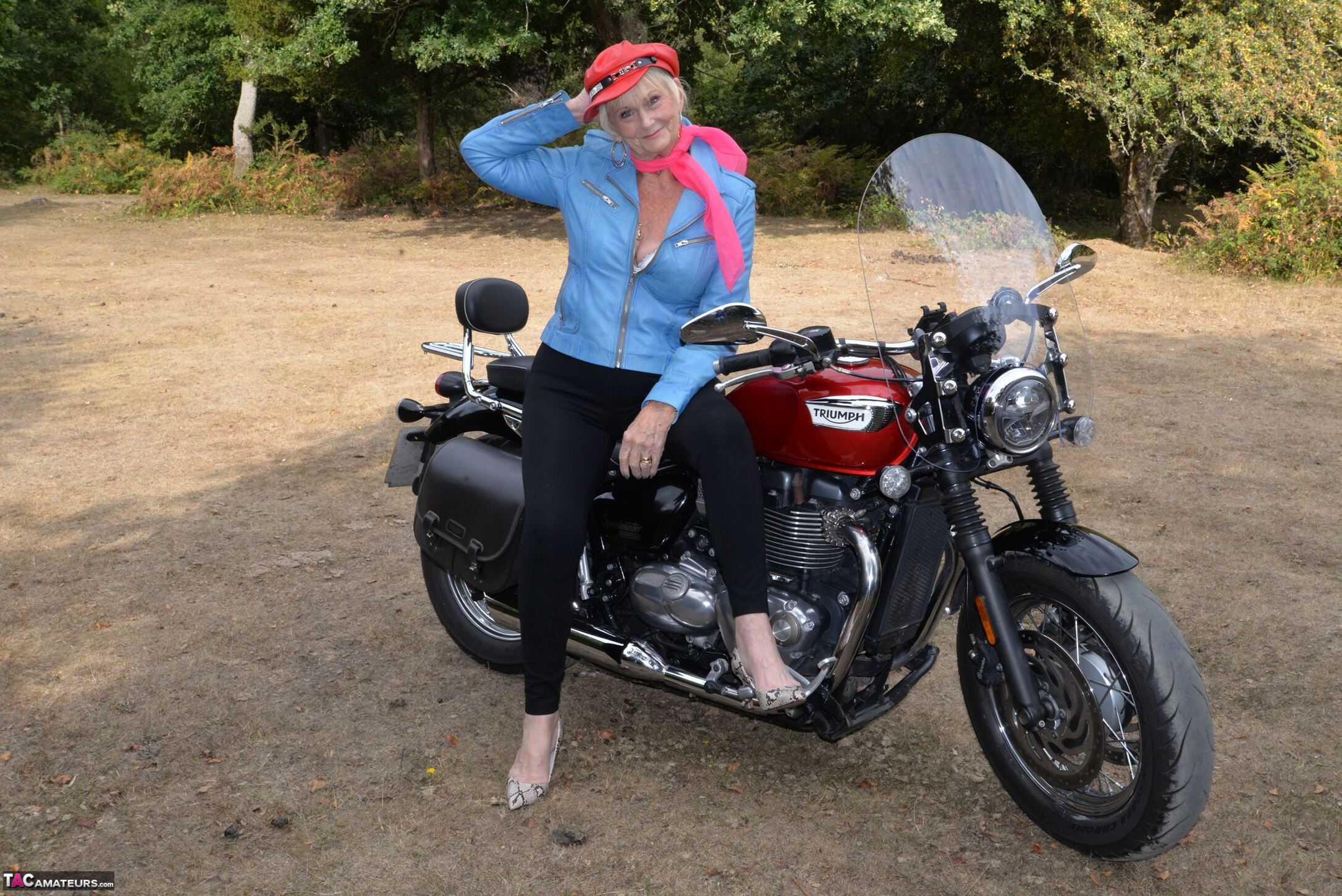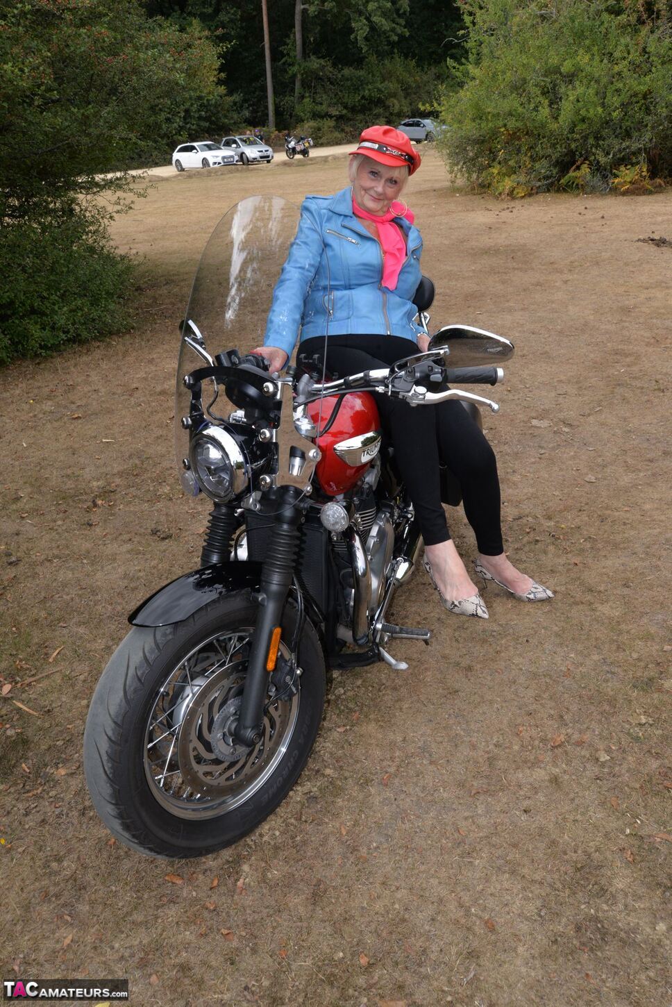 Check out this naughty 82 year old GILF Sparkle posing with her motor Bike.