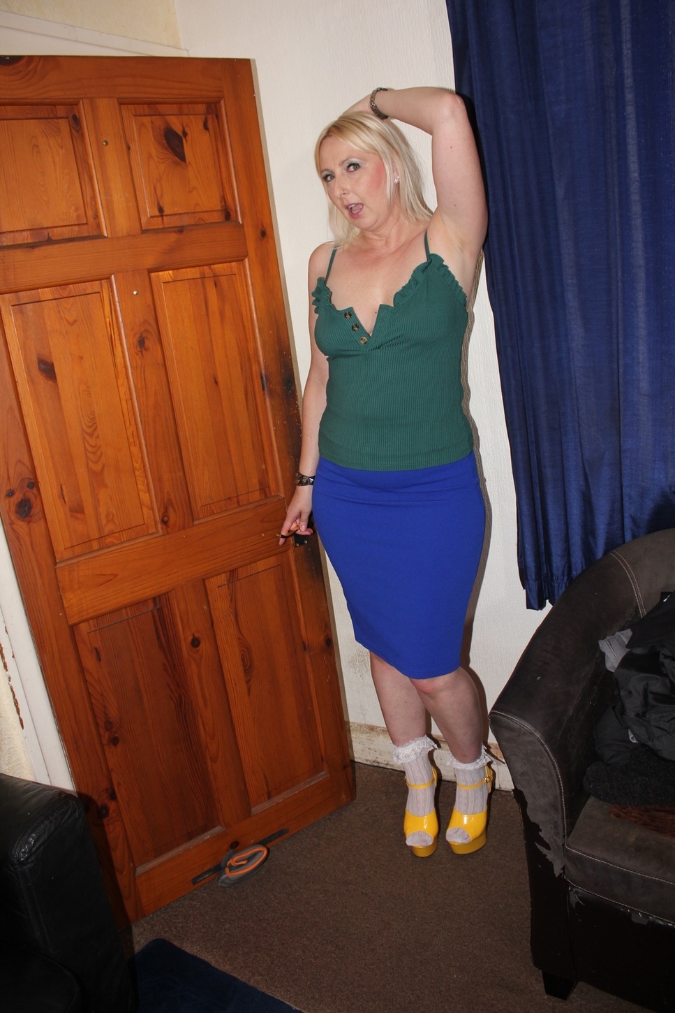 A lovely tight blue outfit,and Fred is ready to stick his fat knob in me just as tight.